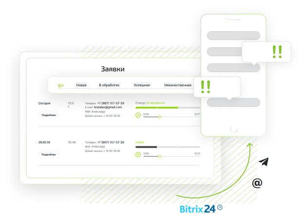 Համակարգը թույլ է տալիս մշակել և Տեսակավորել օգտատերերի հայտերը ցանկացած ձևից և կայքերից: Նրանք իրական ժամանակում գալիս են CRM, և նշանակված օպերատորներն աշխատում են նրանց հետ ՝ փոխելով զանգերի կարգավիճակը և յուրաքանչյուր հաճախորդի համար պահելով մեկնաբանությունների շարանը