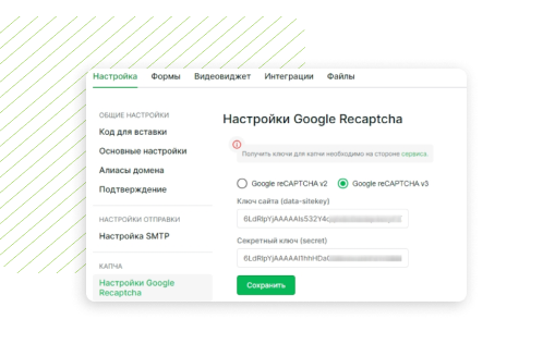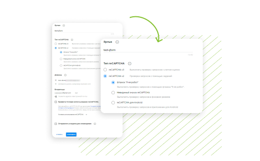 Կայքի կարգավորումներում, որտեղ կտեղադրվի captcha-ն, բացեք «Google Recaptcha Settings» բաժինը և ընտրեք տարբերակը՝ v2 - ստուգել գործողությունները՝ թեստի տեսքով: ; v3 - ձևի պաշտպանություն թաքնված ռեժիմում առանց captcha-ի: