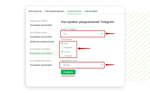 Ցանկից ընտրեք ցանկալի հաշիվը և նշեք այն դաշտերը, որոնք կցուցադրվեն հաղորդագրություններում: Սահմանեք ծանուցման ժամանակը. միշտ ձևը ներկայացնելուց հետո կամ ժամանակի ընթացքում, եթե հայտը չի ընդունվում մշակման համար