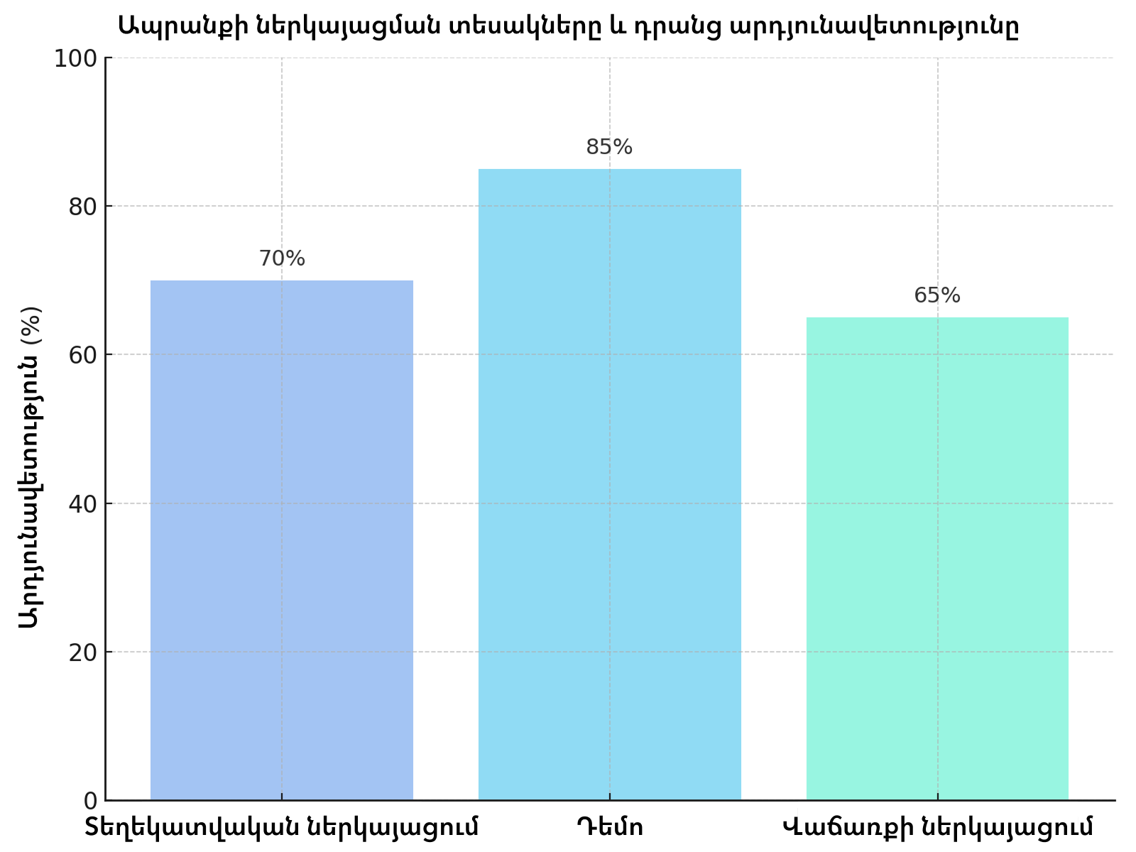 Ապրանքի կամ ծառայության ներկայացումը վաճառքի կարևոր փուլերից մեկն է: Վաճառքի մեջ ապրանքի ներկայացման փուլում վաճառողը հուզական կապ է հաստատում Գնորդի հետ, հետևաբար, գործարքի վերջնական փոխարկումը մեծապես կախված է ներկայացման որակից: այս դեպքում վաճառքի որակը կախված է ապրանքի ներկայացման որակից: Ապրանքի ճիշտ ներկայացումը մեկն է, որը ցույց է տալիս ապրանքի արժեքը և հասցեագրում է հաճախորդի հատուկ կարիքները: Եթե \ u200b \ u200bմիայն առավելություններն ու դրականությունը անմիջապես ցուցադրվեն, մարդիկ կարող են չհավատալ, ուստի ժամանակակից առաջարկությունները նույնիսկ ներառում են ազնիվ պատմություն ապրանքի փոքր թերությունների մասին (օրինակ, թե ինչու է գինը ցածր, Եթե ապրանքը որակյալ է):