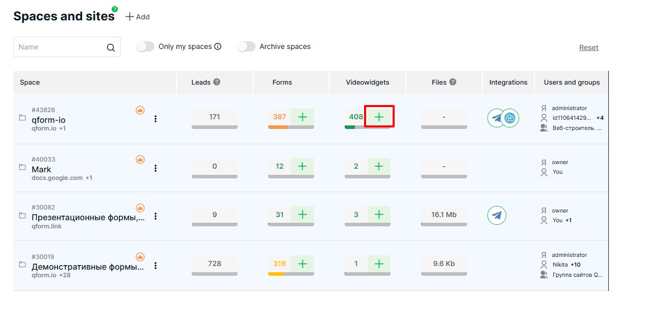 Գնացեք «Տարածություններ և կայքեր», սեղմեք «+» ցանկալի տարածքի կողքին: