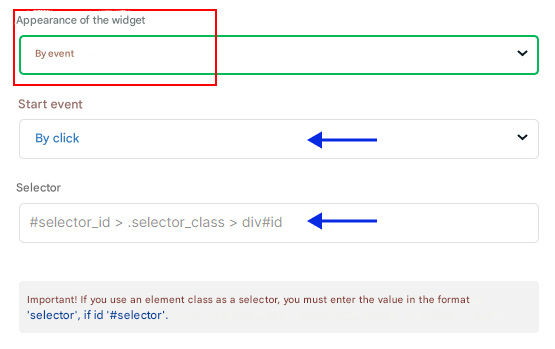 Վիդջեթի տեսքի դաշտում ընտրեք «Ըստ իրադարձության» տարբերակը, այնուհետև սահմանեք մեկնարկի իրադարձությունը.
